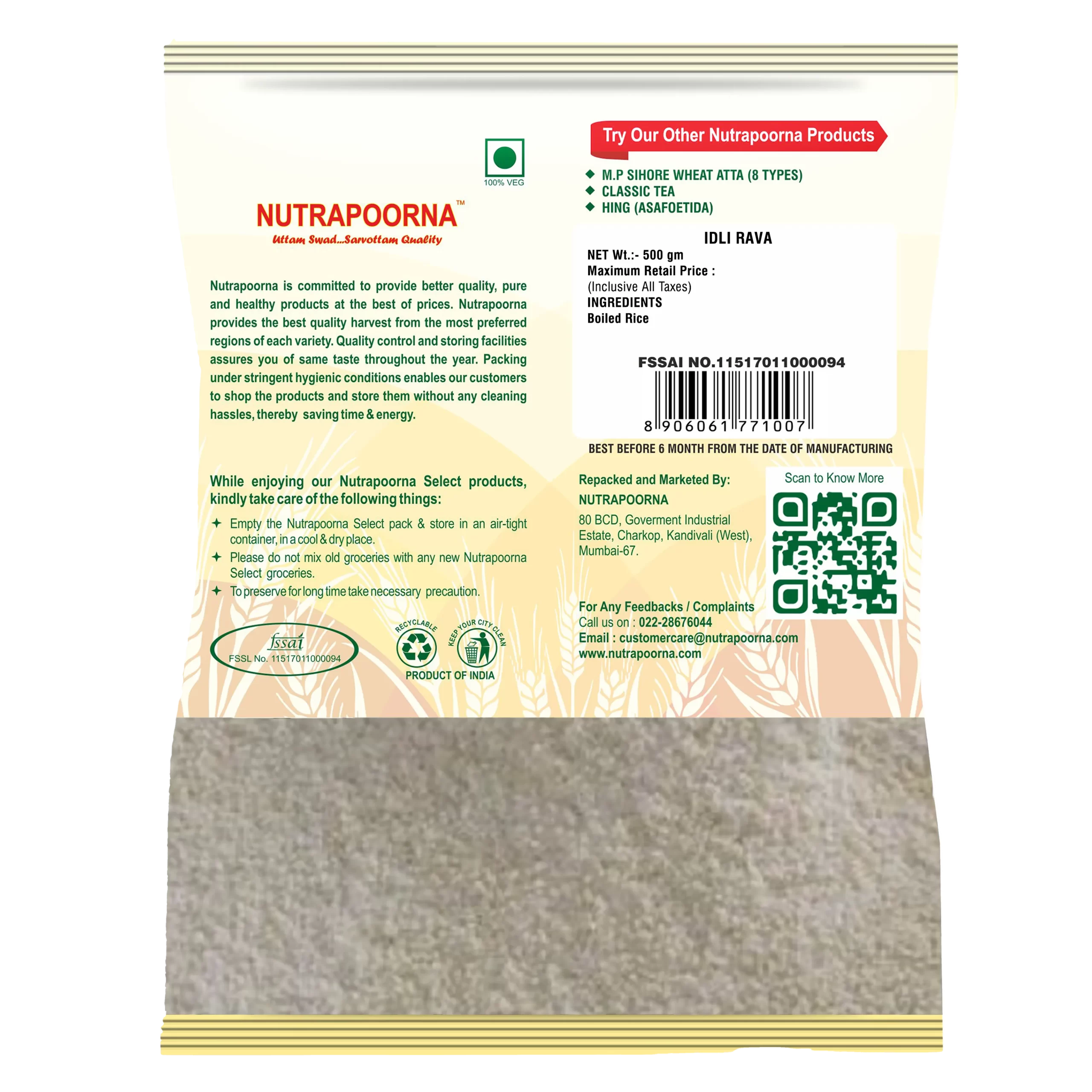 Specially milled for perfect fermentation, Nutrapoorna Idli Rava gives your idlis the soft, fluffy texture you love. Made from high-quality rice, it’s the ideal base for idli, rava dosa, and steamed delicacies.