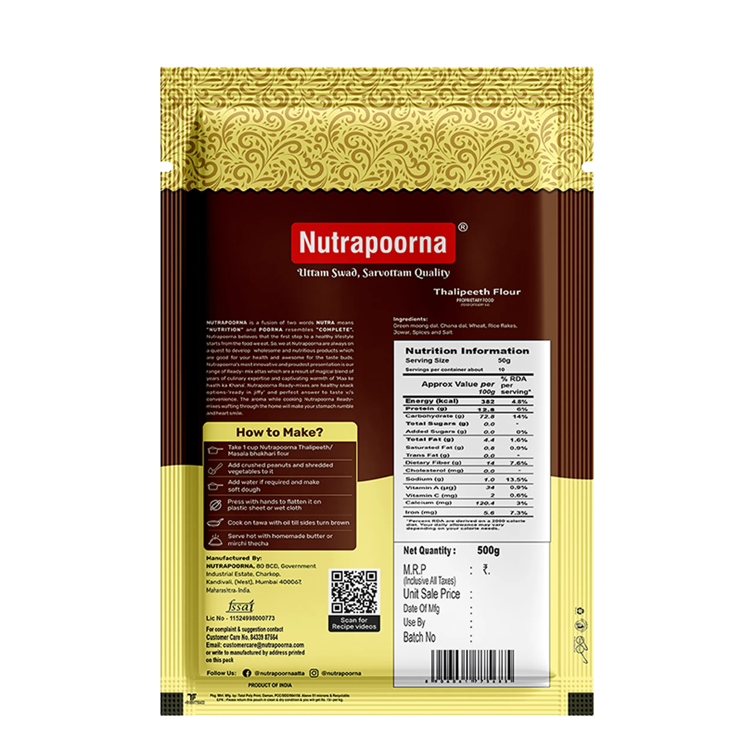 Nutrapoorna Thalipeeth Atta is a wholesome blend of grains and spices, rich in fiber and protein, crafted for crispy, flavorful thalipeeth. Quick to prepare and perfectly spiced, it brings the rustic charm of Maharashtra to your plate—ideal for busy households that value health and taste.